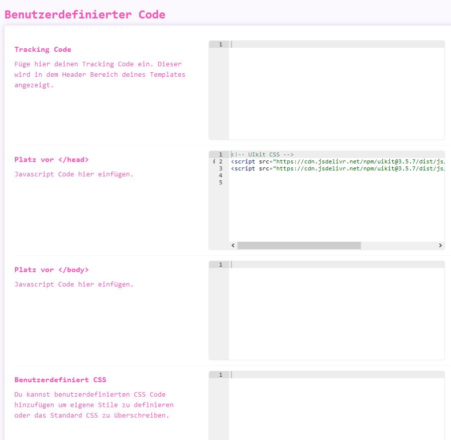 Verwenden Sie Ihren eigenen benutzerdefinierten Code wie CSS, JS, Meta-Tags, Links und Bestätigungscodes.