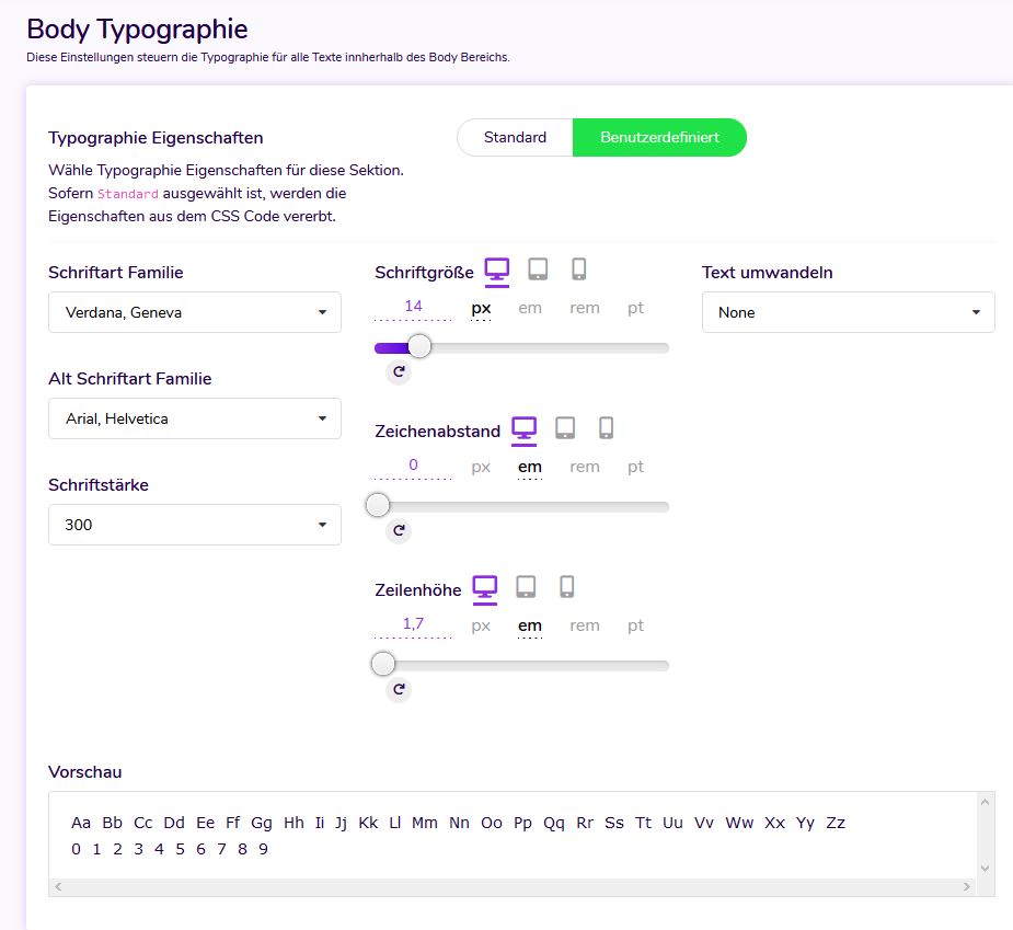Mit den Vorlagen-Frameworks können Sie unterschiedliche Schriftgrößen, Buchstabenabstände und Zeilenhöhen für unterschiedliche Gerätegrößen festlegen.